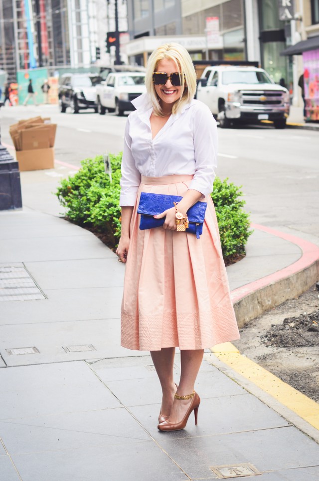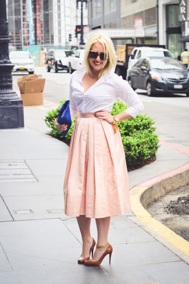 Look #1 featured a Banana Republic skirt that has been hanging in the corner of my closet waiting to be worn for far too long. I paired it with a simple white button down, nude pumps and two anklets to still give this feminine look a little bit of street style flare.