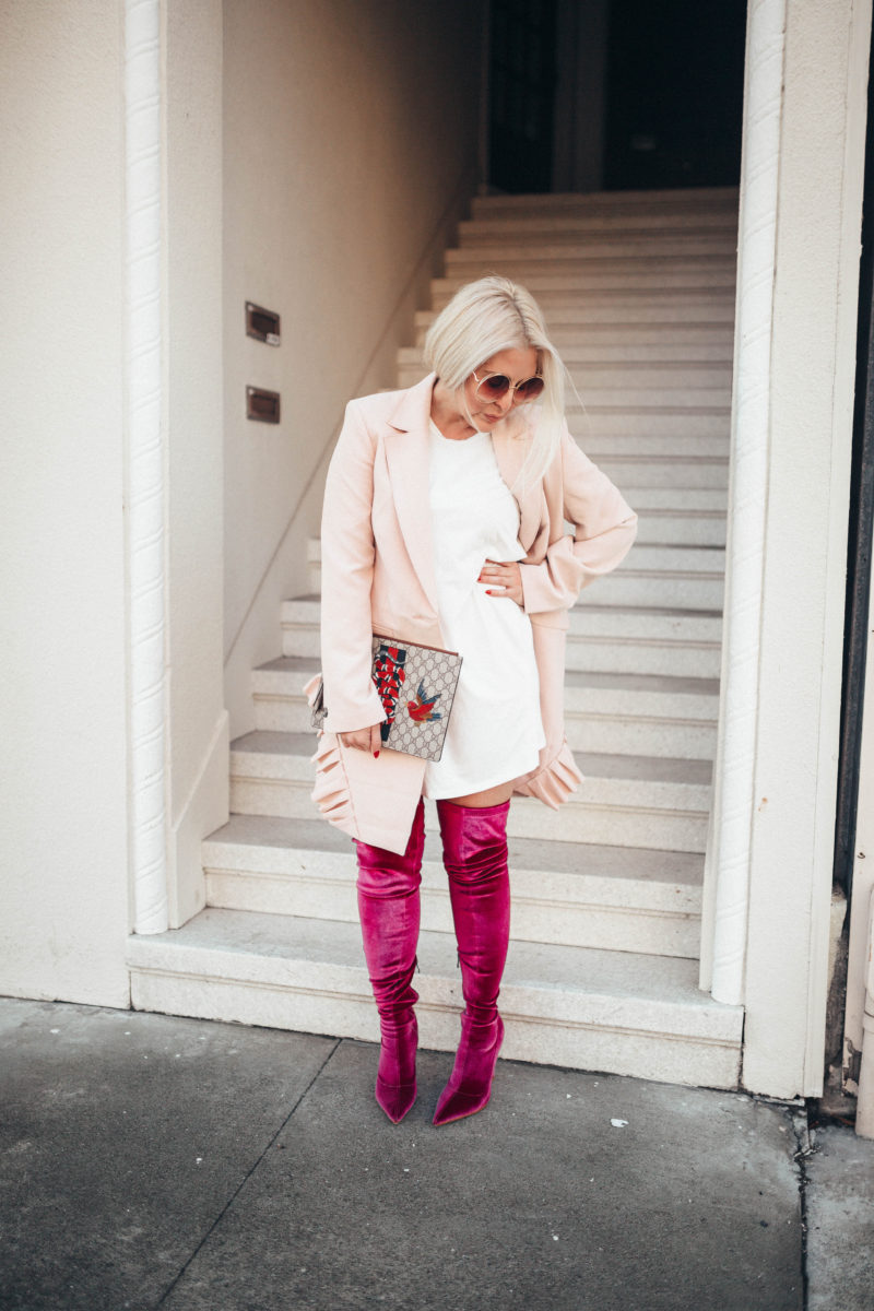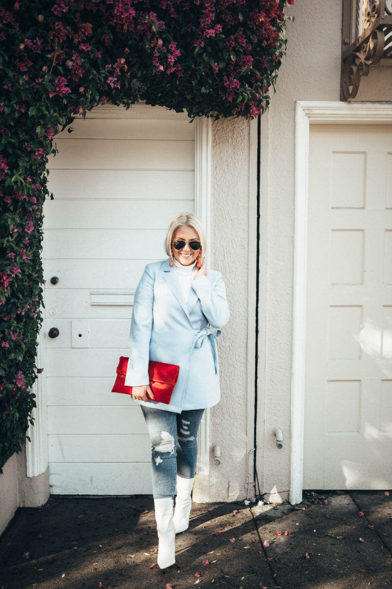 Including the blush topcoat on the left and the baby blue wrap coat on the right.
